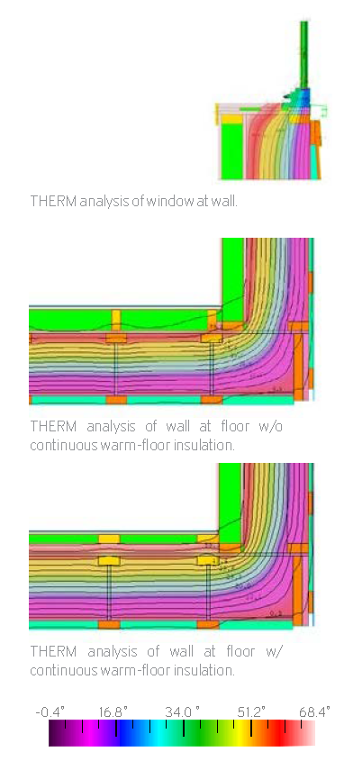 In most cases, in lieu of a vapour barrier, the wall and floor construction uses continuous plywood, taped at its seams, for its vapour retardant properties. Two stud walls are built in parallel to support rockwool batt insulation. To optimize the floor and wall assemblies, thermal bridge simulations were ran at building joints.